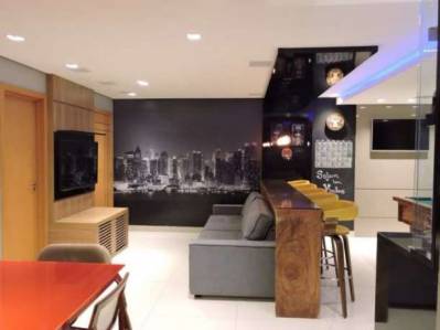 Detalhes do apartamento: Iluminação planejada e automação de áudio, vídeo, luz e ar; pisos dos quartos em laminado, sala e cozinha e área em porcelanato, cozinha planejada, área de serviço e DCE.